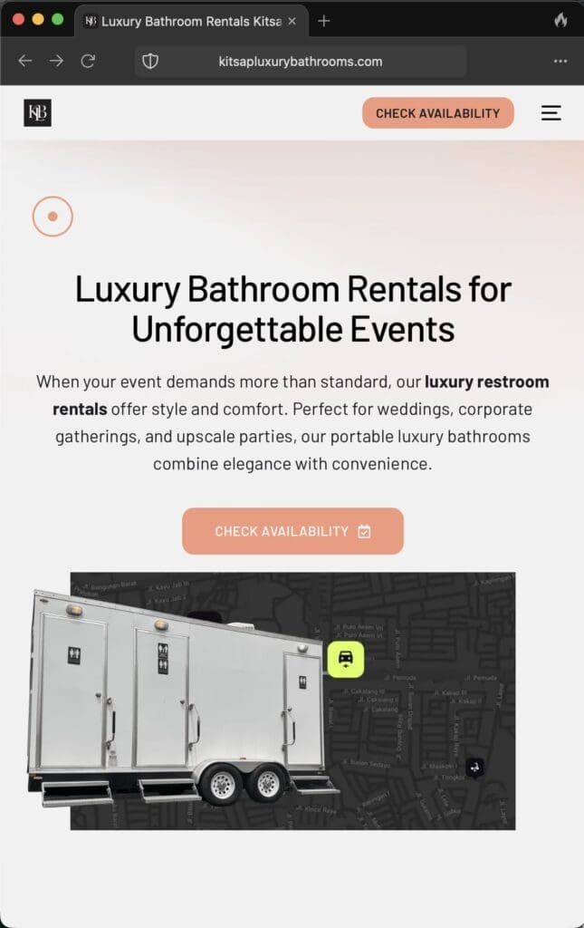 Kitsap Luxury Bathrooms needed a website that would immediately communicate the quality of their service, help customers understand the type of events they serve, and make the process of checking availability and booking far more direct. The live site now positions the company around luxury bathroom rentals for weddings, corporate gatherings, and upscale events, with repeated calls to action to check availability and book online.