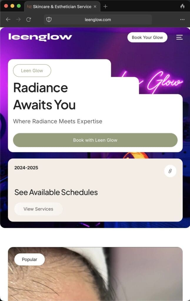 A good website answers those questions clearly and smoothly. For Leen Glow, that meant building a site that feels clean and elevated while still making the booking path obvious and easy to follow. The site now supports service discovery, scheduling, credibility, and brand consistency all in one place.